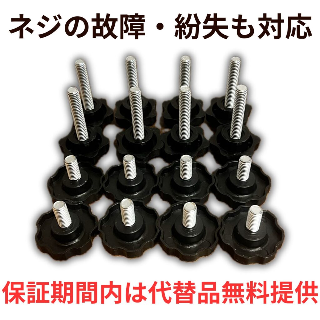 例えば、ネジが曲がった・紛失した場合でも、保証期間内であれば完全無料で代替品を提供しておりますので、安心してご連絡ください。